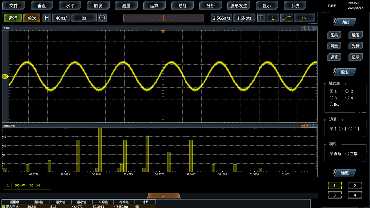 4457系列示波器提供一套完善的分析工具,包括基于波形的光標和基于屏幕的光標、數(shù)學運算、硬件參數(shù)測量、FFT分析、直方圖統(tǒng)計等,為您提供深層次的數(shù)據(jù)挖掘與分析,從而滿足您多方位的測量分析需求。
