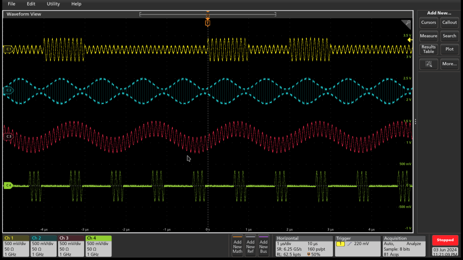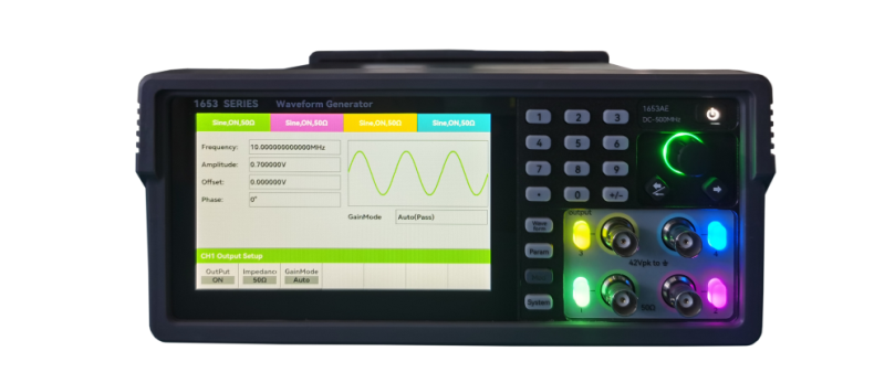 1653系列函數(shù)任意波形發(fā)生器包含120MHz、250MHz、350MHz、500MHz和1GHz 5種帶寬機型,滿足客戶不同輸出信號頻率的信號發(fā)生需求。500MHz帶寬及以下型號支持2或4個輸出通道,通道之間可耦合輸出,如CH2=CH1、CH2=~CH1,CH2=CH1+CH2等,通道CH1、CH2及CH3、CH4可作為差分信號輸出。