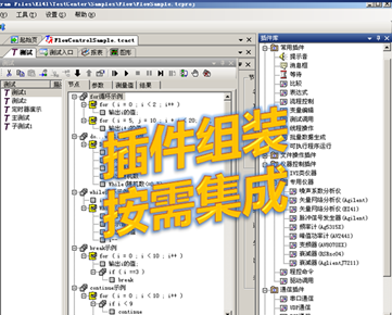測試編輯器是TestCenter為用戶提供的可視化、組裝式、所見即所得的測試程序開發(fā)環(huán)境。TestCenter將測試程序的開發(fā)方式由編碼型轉(zhuǎn)變?yōu)椴寮M裝型,用戶只需從插件庫中拖放所需的插件并組裝它們即可快速完成測試程序的開發(fā)。在測試編輯器中,用戶還可以方便地進(jìn)行循環(huán)、跳轉(zhuǎn)、分支執(zhí)行、條件執(zhí)行及其它復(fù)雜流程設(shè)計(jì)。測試編輯器還提供斷點(diǎn)設(shè)置、單步運(yùn)行等功能,方便用戶進(jìn)行測試程序調(diào)試。
