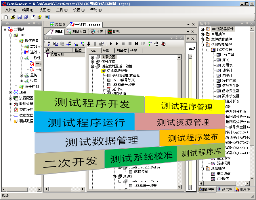 TestCenter軟件平臺(tái)為用戶自動(dòng)測系統(tǒng)軟件的研制提供立即可用的完整解決方案,它提供的工具集合涵蓋了自動(dòng)測試系統(tǒng)軟件的通用基礎(chǔ)功能,包括測試程序開發(fā)、測試程序執(zhí)行、測試資源管理、測試數(shù)據(jù)管理、測試軟件發(fā)布等。